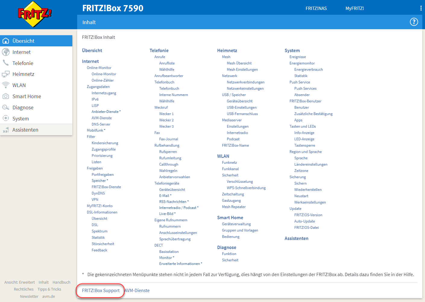 Ganz nach unten auf FRITZ!Box Support klicken