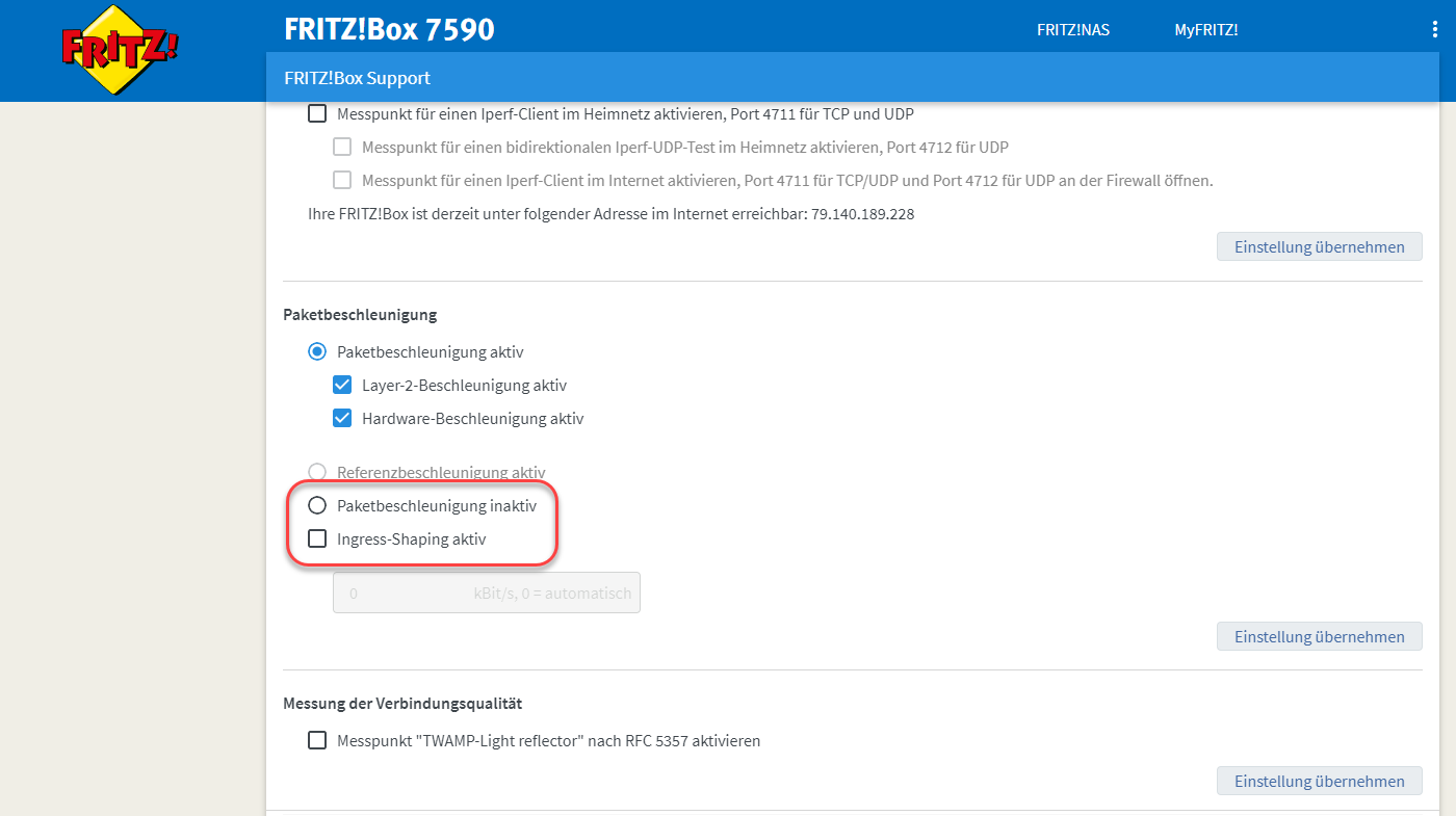 Im Supportmenü der Fritzbox nach unten zur Paketbeschleunigung scrollen: